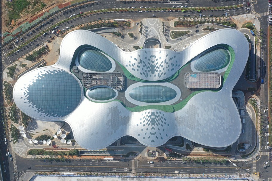 本項(xiàng)目是海南自由貿(mào)易港的一項(xiàng)“超級(jí)工程”,總用鋼量約為4.1萬(wàn)噸,南北約360 米,東西向約190 米,接近國(guó)家體育館“鳥(niǎo)巢”體量。外立面超大玻璃幕墻包含7000塊玻璃和23000塊鋁板,造型屋面包含2100塊玻璃和66000塊鋁板,外幕墻圍繞8000米燈帶和4000燈具,是外觀主視覺(jué)中最亮眼的存在。